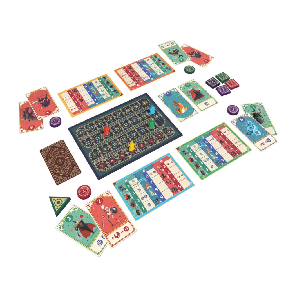 36 cartes6 jetons ronds de mise6 jetons carrés de mise1 jeton 1ère joueuse6 pions Mage6 grandes cartes Aide de Jeu1 plateau de score