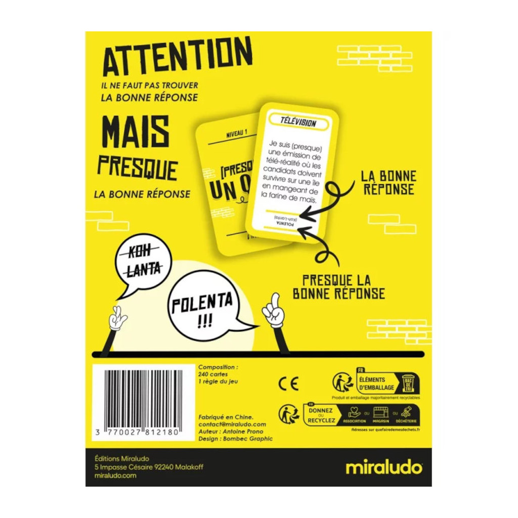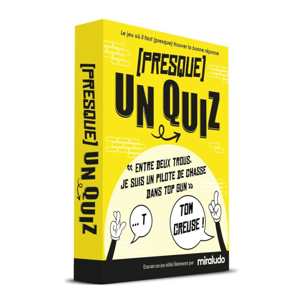Presque un Quiz est un jeu de culture populaire où vous devez deviner des titres de films, des noms de personnalités, des événements historiques… avec un twist : la réponse attendue est fictive mais toujours inspirée d’un véritable titre, nom ou événement, dont on a changé au moins une lettre ou une syllabe. À vous de la retrouver à partir des indices qui vous sont donnés !
