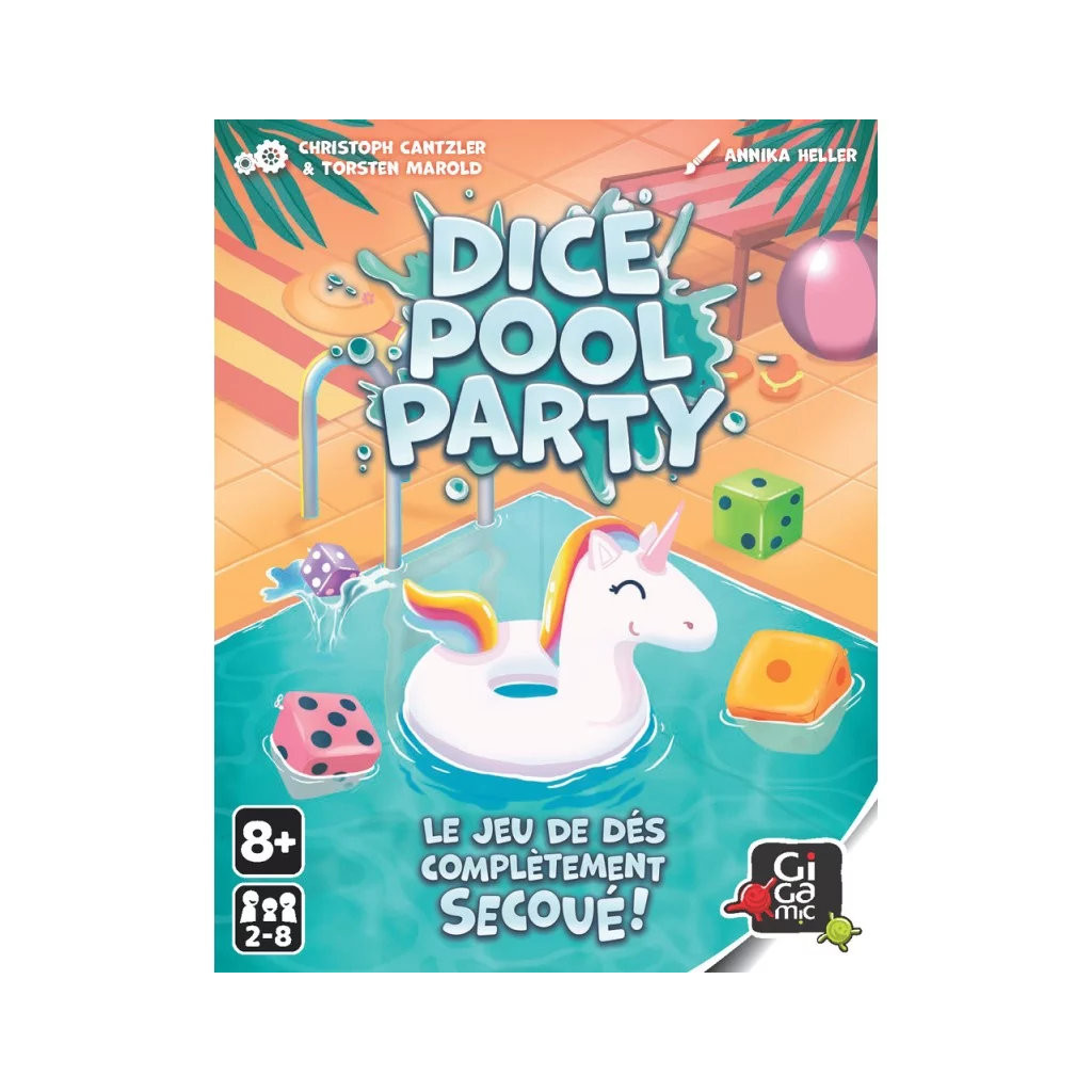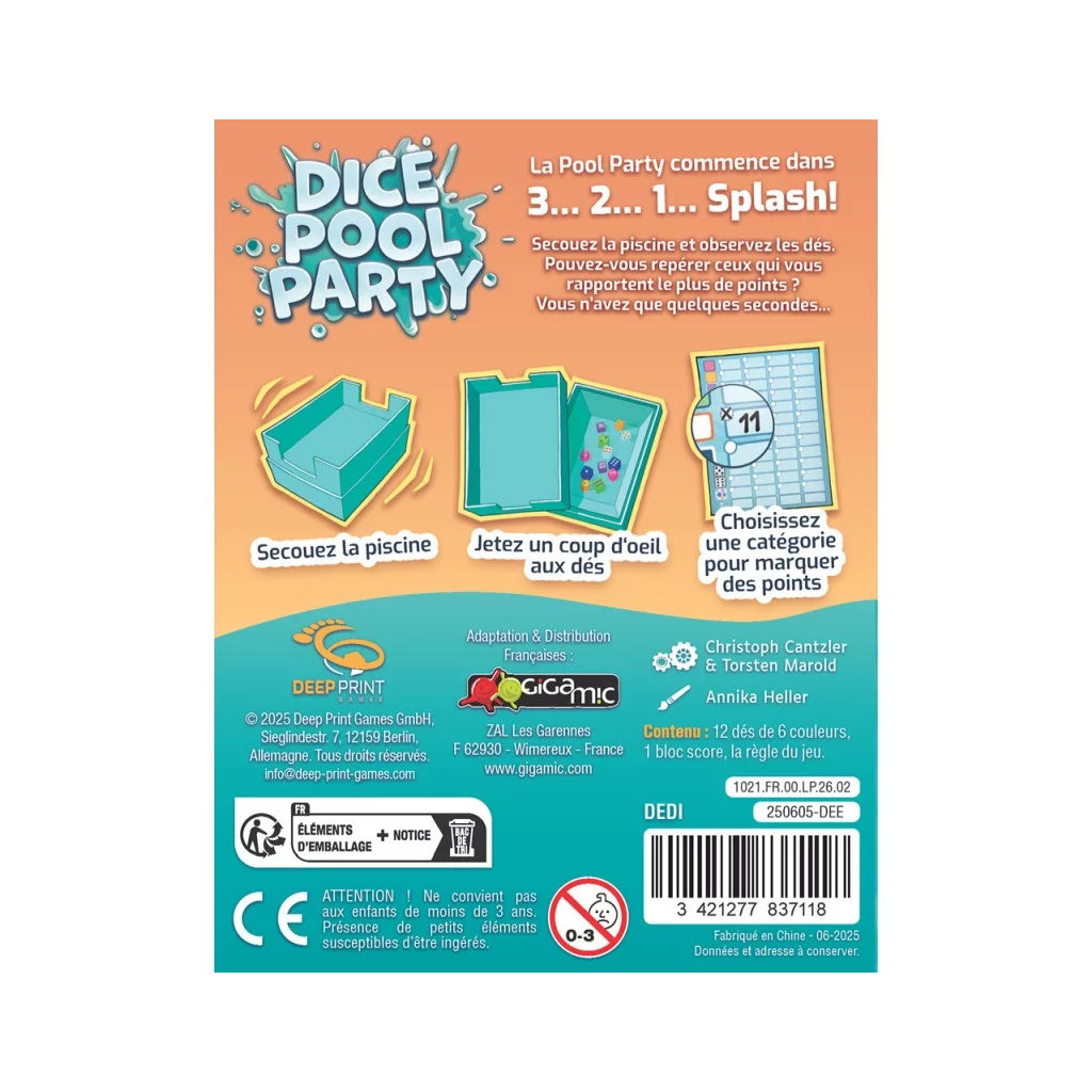 Avec Dice Pool Party, transforme ta boîte de jeu en piscine à dés ! Chaque joueur observe un lancer de dés colorés pendant quelques secondes avant de choisir secrètement une catégorie de score. Observation, mémoire et prise de risque sont au cœur de ce jeu rapide et malin. Dice Pool Party promet des plongeons dans le risque parfois réussis, parfois douloureux !