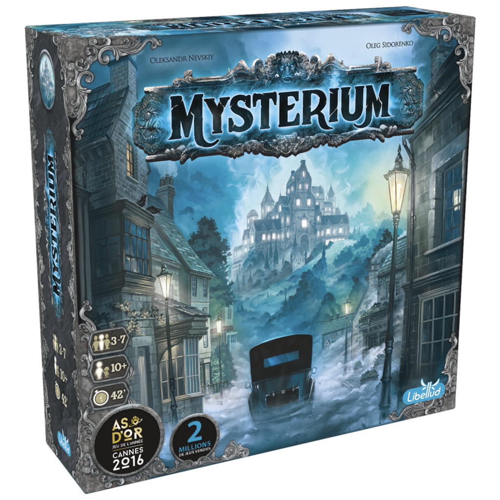 Dans Mysterium un crime à été commit, le fantôme rode encore dans le manoir. Un joueur prend le rôle du fantôme et va devoir donner une ou des cartes (appelé vision) aux autres joueurs. Qui eux jouerons des enquêteurs, il devrons trouvé un personnages, un lieu, et une arme. Le fantôme à toutes les réponses mais il ne peut pas parler. Jeu familiale et de coopération avec un matériel vraiment excellent et magnifique ! je vous le conseil vivement !