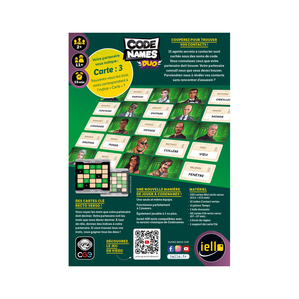 Vous connaissez les Noms de Code que votre partenaire doit deviner et celui-ci connait ceux que vous devez trouver. En donnant chacun à votre tour un unique mot comme indice reliant plusieurs cartes sur la table, tentez de trouver tous vos Noms de Code avant la fin du temps imparti. Prenez garde, cependant, à ne pas rencontrer l’un des Assassins ou vous perdrez immédiatement la partie...