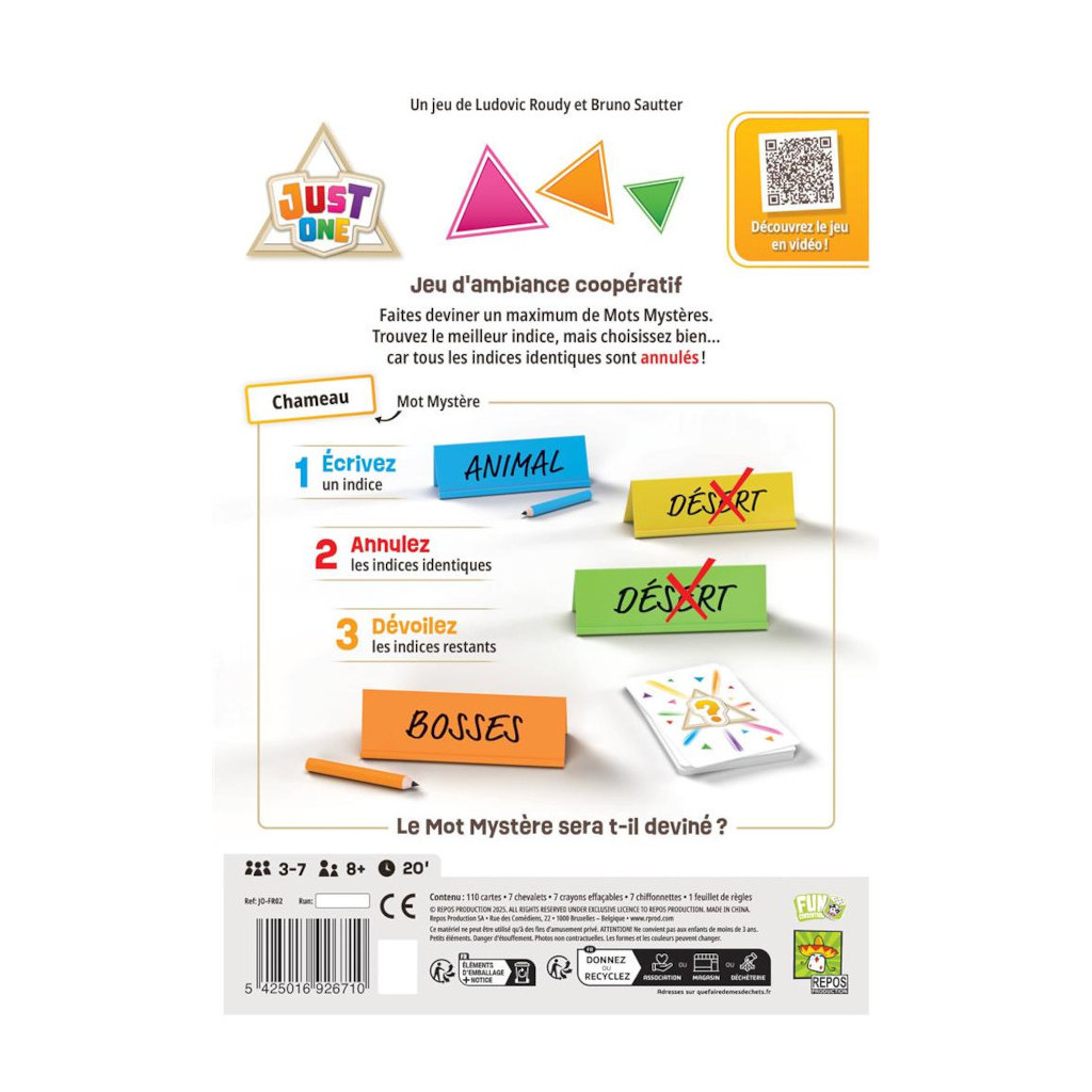 Just One Nouvelle EditionJust One, le jeu d'ambiance qui plaît à toute la famille (primé au Spiel des Jahres 2019), revient dans une version relookée. Découvrez une boîte modernisée et un contenu optimisé avec 550 nouveaux mots ! Un joueur doit deviner un mot tiré au hasard et ferme les yeux. Les autres écrivent chacun un indice sur leur chevalet. Puis, ils sont comparés. Si certains sont identiques on les efface ! Le joueur se contentera des indices restants pour trouver le mot. Juste One est un jeu coopératif, le but commun étant de trouver un maximum de mots.