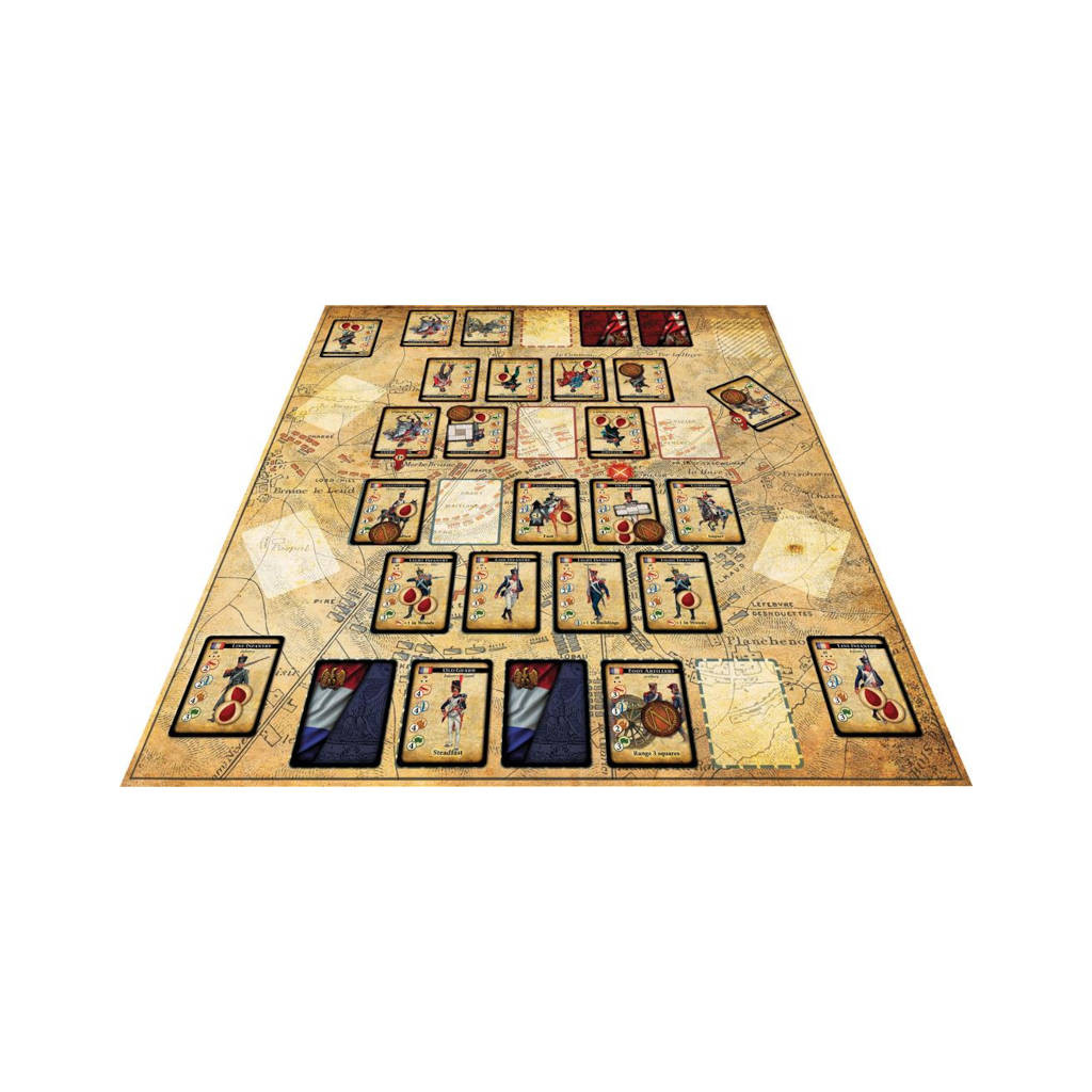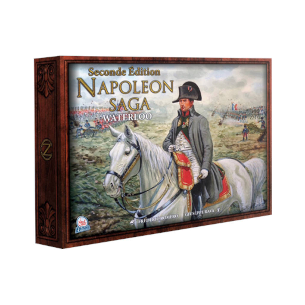 Napoleon Saga est un jeu de stratégie pour deux joueurs qui vous invite à reconstituer l’une des grandes batailles de la campagne belge de Napoléon, Waterloo. La bataille se joue sur un double plateau, placé entre les deux belligérants, représentant le champ de bataille.Chaque joueur possède ses pioches de cartes : Stratégie, Objectif et Armée. Chacun déploie ses cartes Unité sur le champ de bataille et utilise ses cartes Stratégie pour attaquer, se déplacer, modifier les conditions des affrontements, influer le plateau de jeu, etc.Les actions comme les jets de moral, se résolvent par la comparaison de valeur additionnées d’un jet de dé, devant atteindre le seuil de difficulté.Il en est de même pour les combats. Pour les tirs, c’est un seuil à atteindre pour infliger une blessure à l’unité ciblée. Pour la mêlée, c’est un jet en opposition entre les deux adversaires. Il est ainsi possible d’éliminer une carte Unité adverse ou l’obliger à faire retraite.La partie se termine si les lignes adverses sont particulièrement dégarnies ou si un joueur cumule 10 points de victoire (unités éliminées, objectifs et cartes de Stratégie).Deux decks Armée prêts à jouer sont fournis pour vos premières parties. Ensuite, vous pourrez créer vous-même vos decks.Cette seconde édition des règles a été révisée et clarifiée sur les suggestions de la communauté de joueurs.