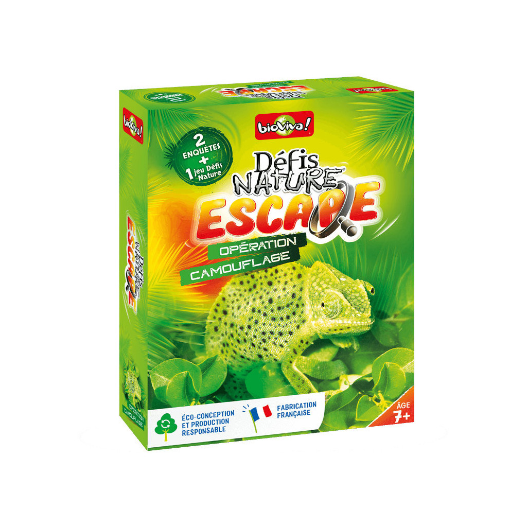 Défis Nature Escape - Opération CamouflageDéfis Nature escape opération camouflage regroupe 2 enquêtes et un jeu Défis Nature.Arriverez-vous à résoudre les enquêtes grâce aux cartes Défis Nature incluses. Pour y arriver, vous devrez étudier les cartes dans leurs moindres détails pour y trouver des indices, des similitudes, des infos étonnantes et vous en servir pour résoudre les énigmes.Jeu de réflexion idéal pour les personnes qui aiment résoudre des enquêtes !La boite contient 2 livrets, 1 jeu de cartes Défis Nature, 1 crayon, 1 carte à reconstituer, 1 règle du jeu et les documents d'enquête.Fabriqué en France / Jeu éco-conçu / Fabrication responsable.